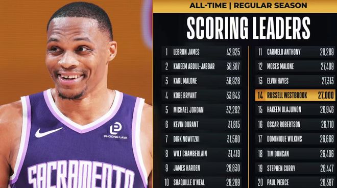 - 威少27000分里程碑!国王26分惨负鹈鹕 13连败创搬迁萨城最长纪录