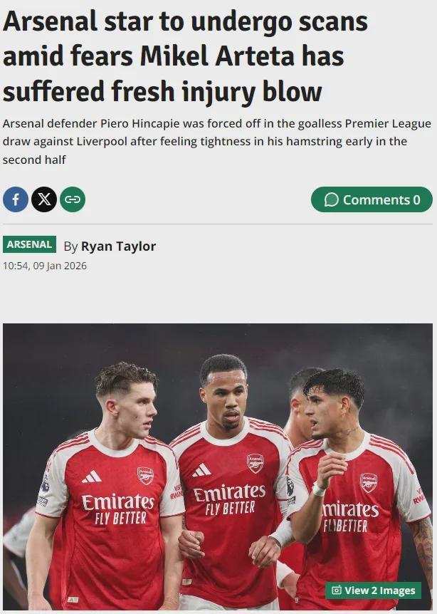 镜报和伦敦足球记者RT发文表示,因卡皮耶将接受扫描,阿森纳担心这名后卫在对利物浦的比赛中腿筋受伤。